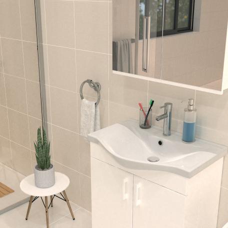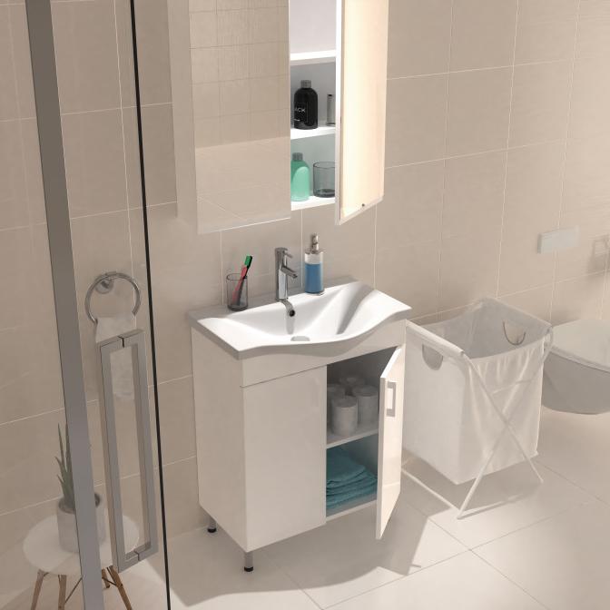 Toaletni ormarić LIBERO 0949 Toaletni ormarić Libero 65 sa lavaboom kombinuje praktičnost i elegantan dizajn, savršen za moderne kupatilske prostore. Sa širinom od 65 cm, ovaj ormarić pruža dovoljno prostora za odlaganje, omogućavajući uredno i organizovano kupatilo. Njegov minimalistički dizajn ulepšava enterijer, a visokokvalitetni materijali obezbeđuju dugotrajnost i otpornost na vlagu. Sa lavaboom Način otvaranja: Vrata Dimenzije: 645 x 850 x 465 mm Ručke su bele od kvalitetne plastike, dok su nogare metalne Korpus izrađen od oplemenjene bele iverice, a front od farbanog medijapana visokog sjaja Odgovarajuće ogledalo možete pogledati OVDE
